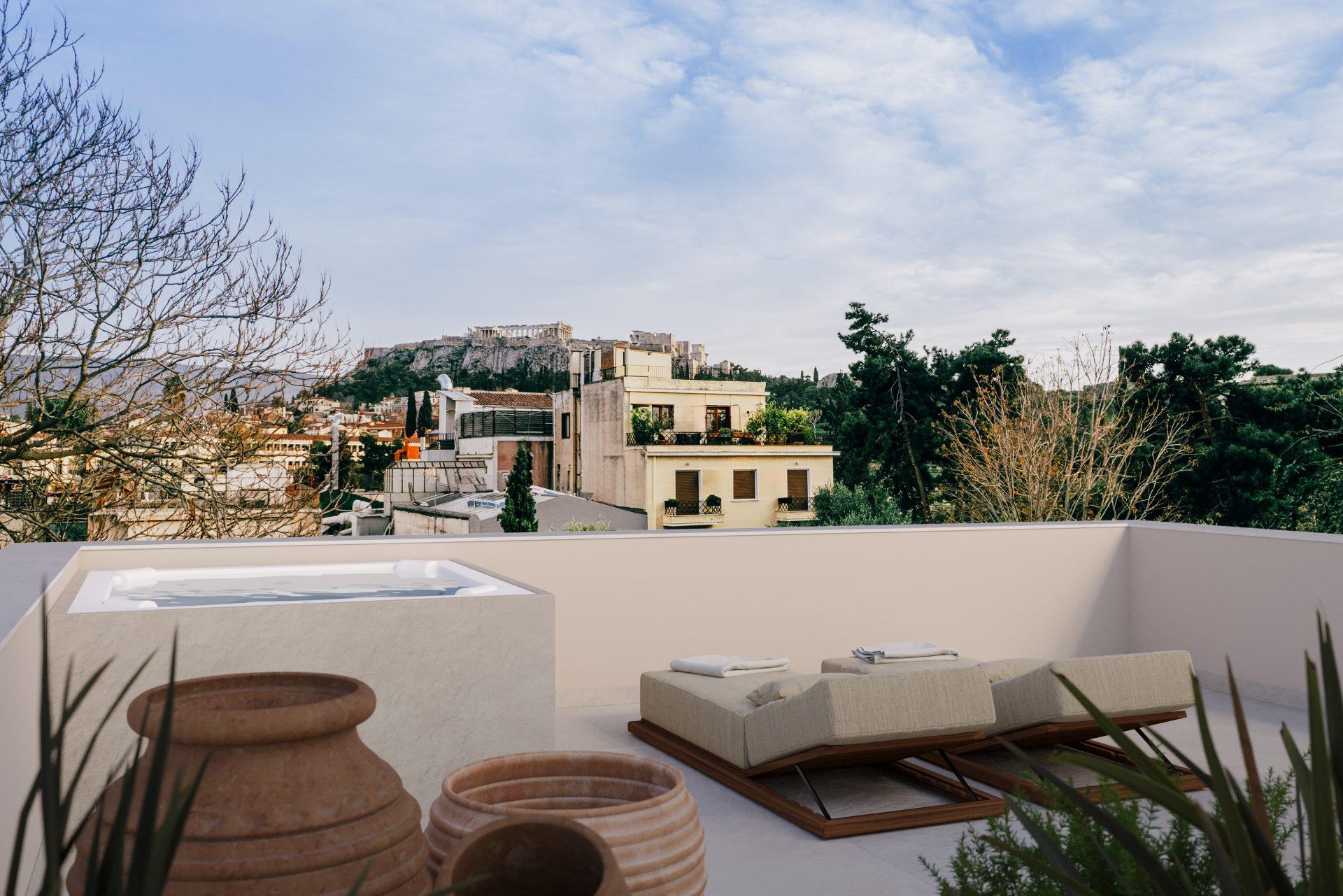 Other suites with special features include a balcony with an outdoor jacuzzi facing the iconic Acropolis—ideal for unwinding after a day of exploring the city. While this is intimate on its own, the Spa Suite spans two floors—the yard-view bedroom on the first, with an indoor private jacuzzi on the ground floor, secluding you completely.