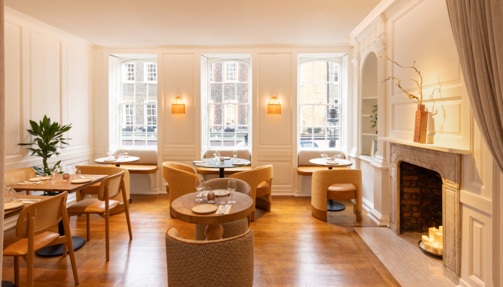 Delamina Townhouse’s decor strikes a harmonious balance between the building’s period charm and modern design. Located in a Grade II listed Georgian townhouse, the restaurant has been carefully restored to highlight its original features, including high ceilings, sash windows, and intricate mouldings. The interiors are light-filled and airy, with soft furnishings and neutral tones creating a welcoming and relaxed atmosphere. Artworks blend seamlessly into the surroundings, adding a personal touch to the design. The dining areas include a generous dining bar, two drawing rooms with fireplaces, and several private dining spaces, ensuring a range of intimate settings. The small outdoor terrace provides a charming spot for al fresco dining, enhancing the overall inviting feel of this vibrant Covent Garden venue.