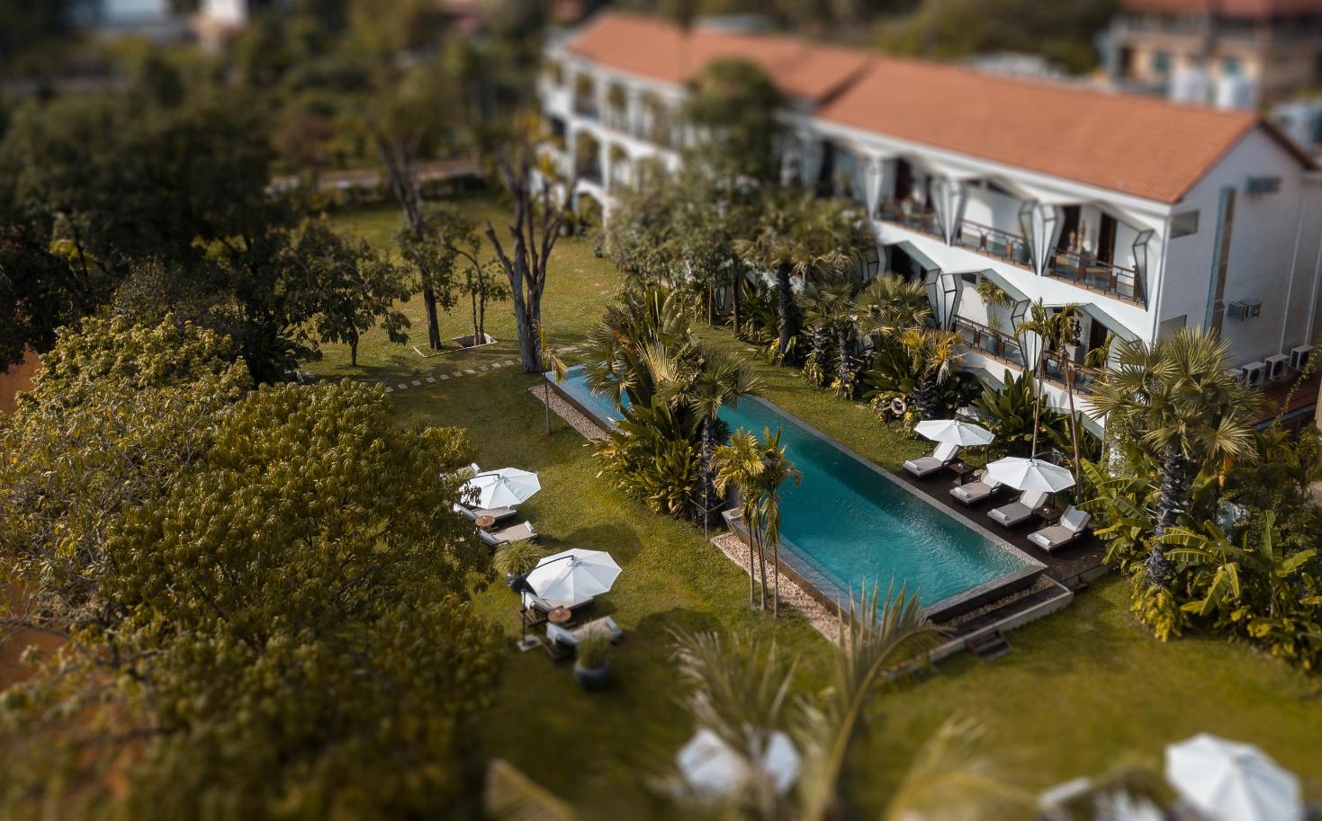 The interiors blend timeless Art Deco touches with a modern Cambodian flair. Striped 1930s armchairs sit beside wind-up gramophones, while vibrant local art hangs in open, leafy spaces. One standout? The restaurant’s ceiling adorned with handmade silk flowers in crisp white rows.