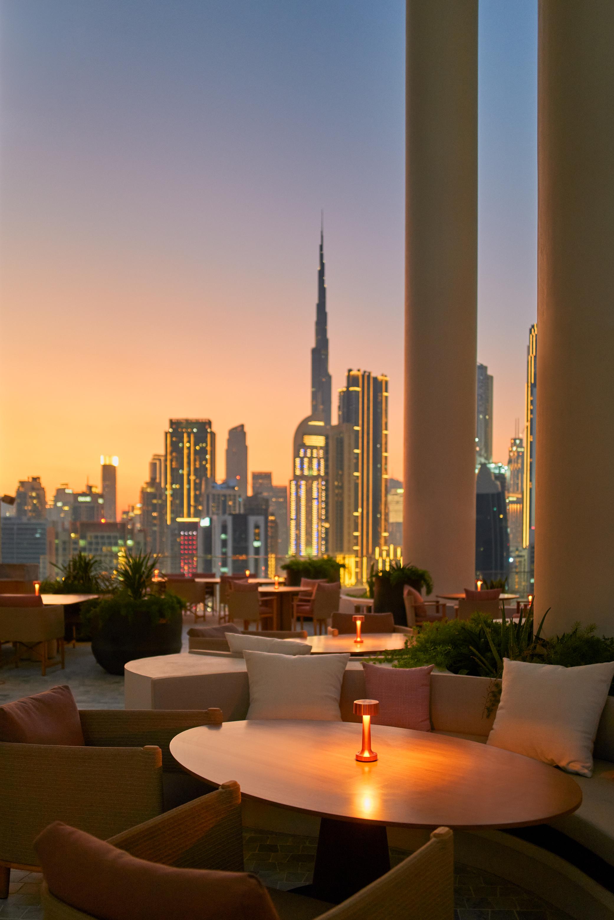 Sitting on the edge of the Marasi Bay Marina in central Dubai, the Dorchester Collection’s Lana Hotel certainly lives up to the city’s expectations of striking architecture. With its interlocking puzzle piece design and bold perpendicular lines that define the structure, the hotel blends into Dubai’s skyline but still manages to be unique and dominate the waterfront. Past the glamorous lobby where burgundy-clad staff exude sophistication, I ascend to the 18th floor via a colourful lift to reach the restaurant.