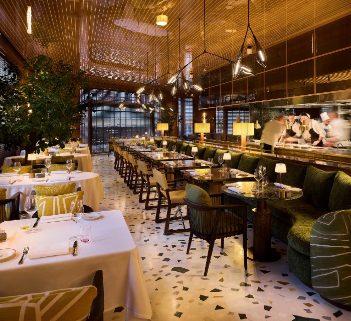 The restaurant establishes this immediately. Citrus tones, terrazzo flooring and an interplay between indoor and outdoor elements set the atmosphere without overcomplicating it. Olive trees sit within the dining room, while ambient lighting and polished wood panelling create a space that feels both elevated and intentionally social. It is designed to be seen, but not at the expense of comfort.