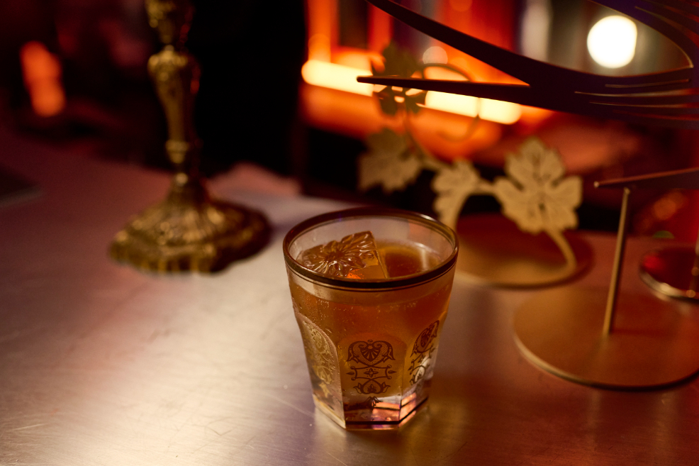Upon arrival, we are taken to the parlour, where we are greeted with tailor-made cocktails by the award-winning bartender, Remy Savage. I drink a cocktail made of fine cognac, bergamot, tomato ponzu, spices, and chilled with ice cubes containing gold leaf.