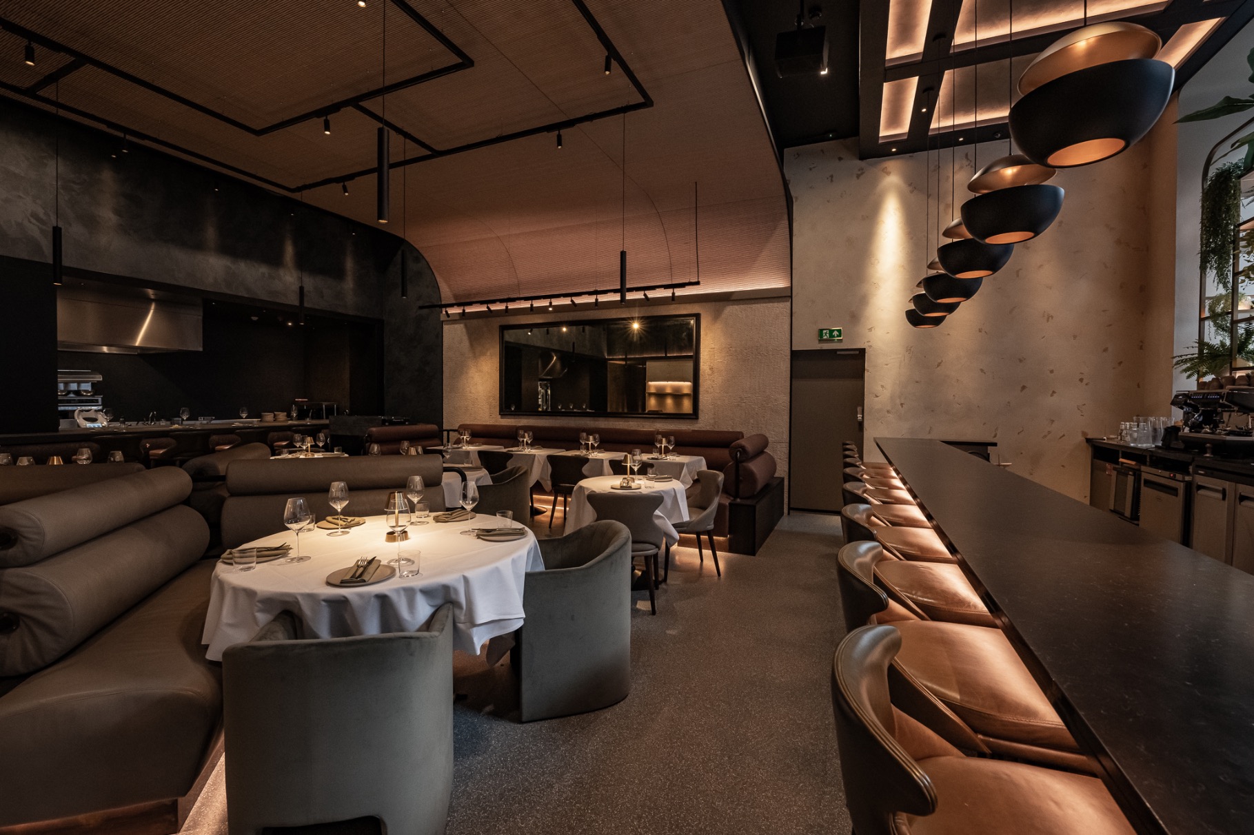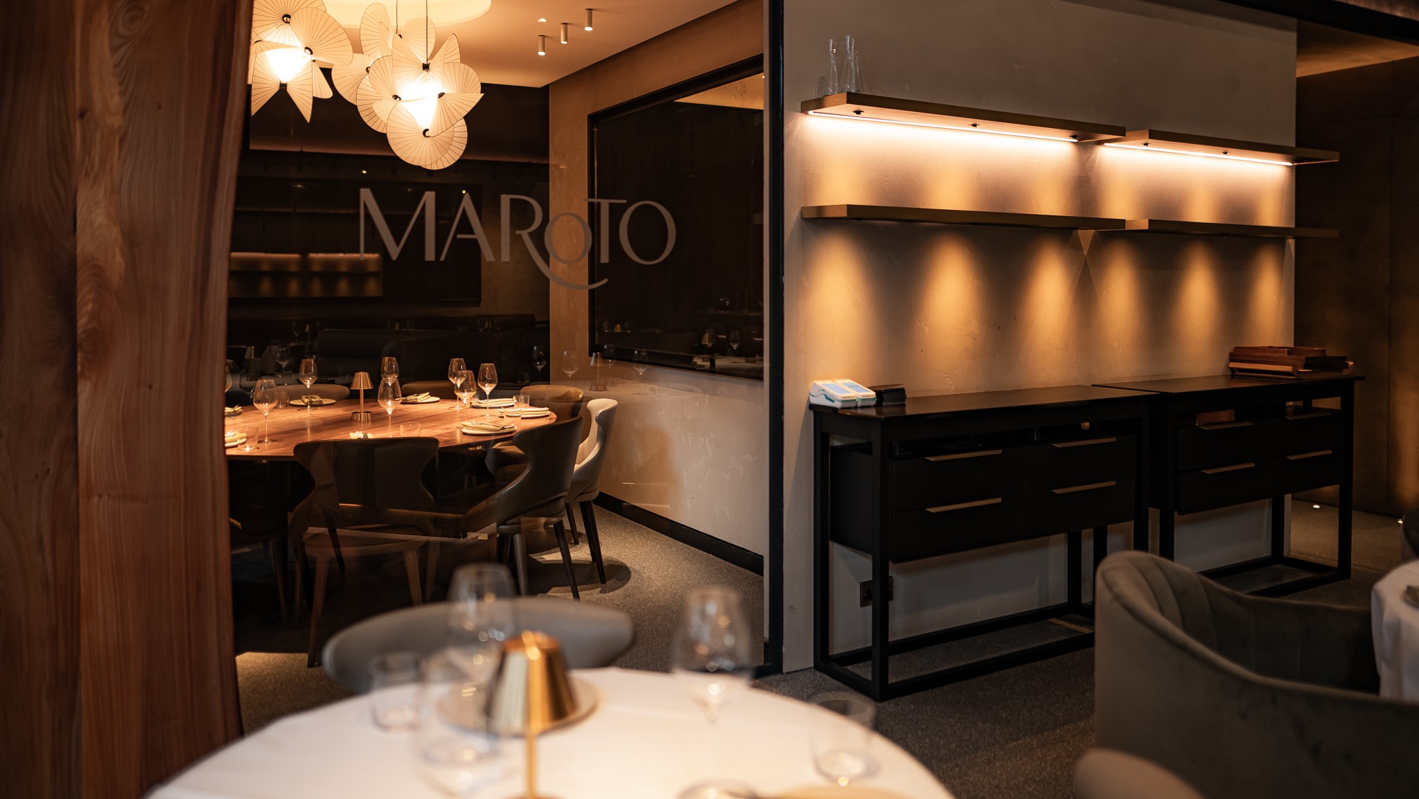 Smart and modern, Maroto’s dining room is elegant and welcoming—wood panels, stone, neutral colours and black light fixtures all creating a striking minimalistic feel. If you prefer a front-row experience, the open kitchen has counter seatings, allowing you to watch the action. Alternatively, for a more intimate dinner, you can book the private dining room behind the wine walls.