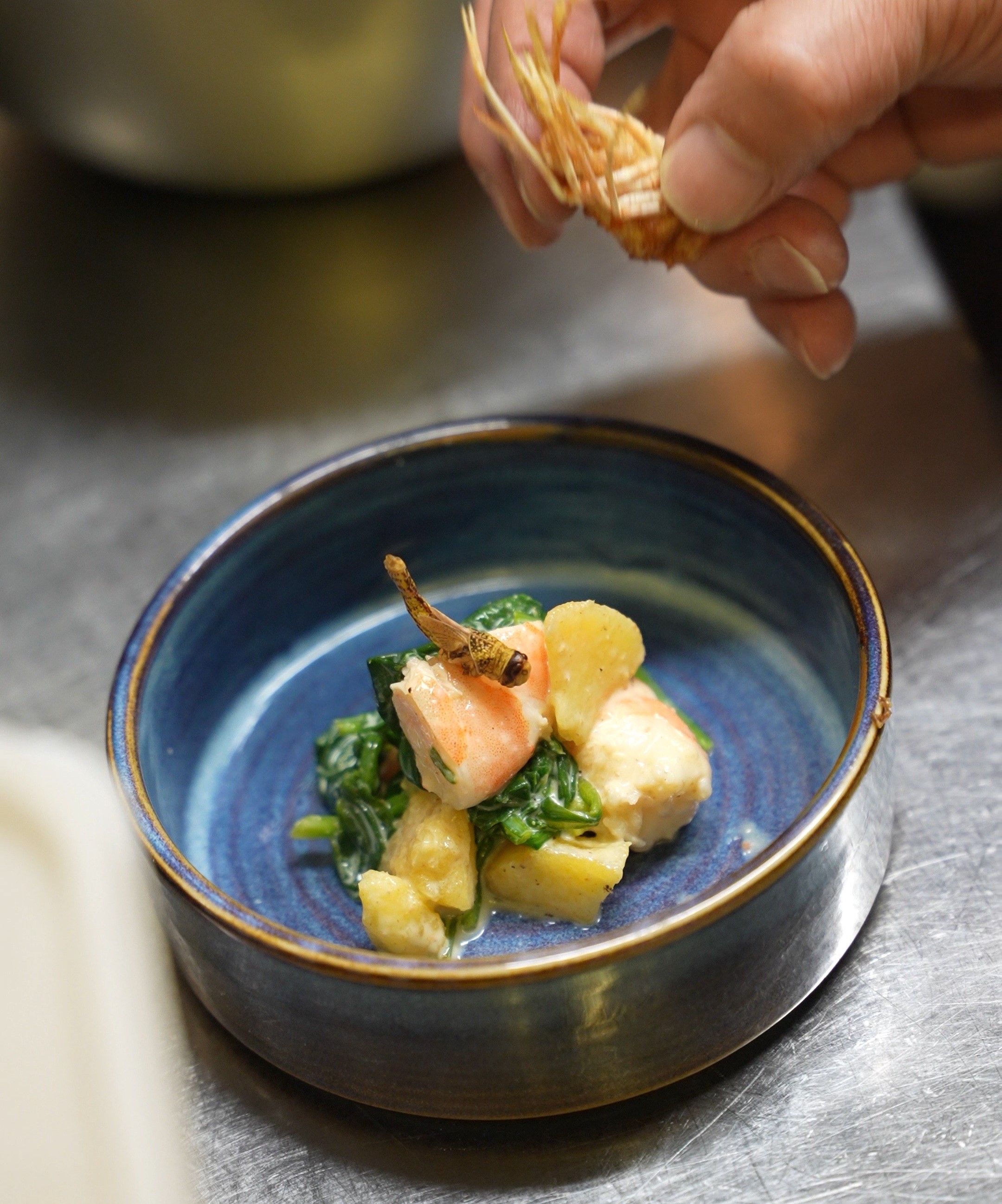 Mezcal Sentir uses a variety of agave types, including the more common Espadín, as well as rarer and wild agave species. This offers the drinker a range of flavours and aromatic profiles, such as the smooth and herbal Sentir Cirial which accompanied our next course – shrimp, spinach and peach salad with a deep-fried grasshopper for extra crunch! – and the intense Tobalá which has distinct earthy and smoky tones.