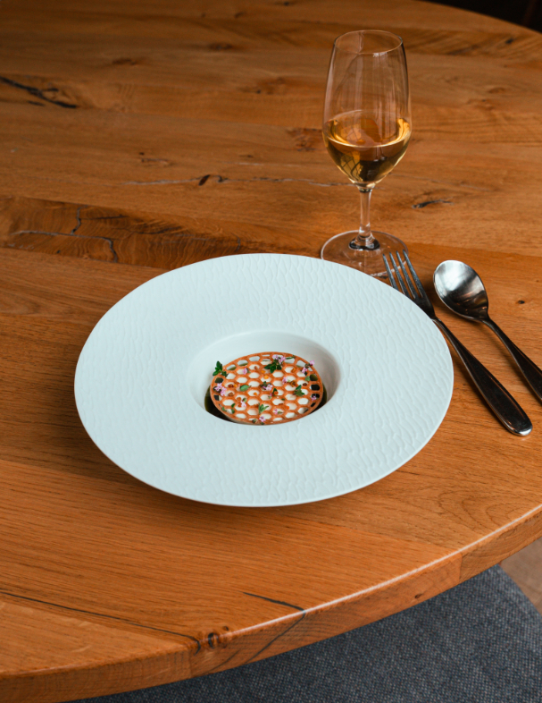 I opted for The Full tasting menu; a seven-course journey. The experience was a delightful exploration of textures and tastes, commencing with an enjoyable array of countryside-inspired snacks. The Morel Har Gow, filled with earthy morel mushrooms, set the stage, followed by the inventive Silage Taco and the comforting Mrs Dales’ Fidget Pie; toasted Hay Campaillou with Ampersand Butter, each bite whispered tales of the land’s abundance.