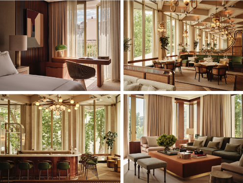 Upon entering the main façade, there is a striking interior design by the French designer, Joseph Dirand. The golden fixtures juxtaposed with the natural stone exterior invite the guests to a mix of modern and contemporary design, embracing the history with contemporary luxury. The distinctive angular design of the exterior façade, meeting the sleek and sophisticated interior, presents the hotel in an unparalleled fascination to its users. The experience of luxury, which is represented in the common areas, is amplified by the design of the 144 all-suite accommodations.