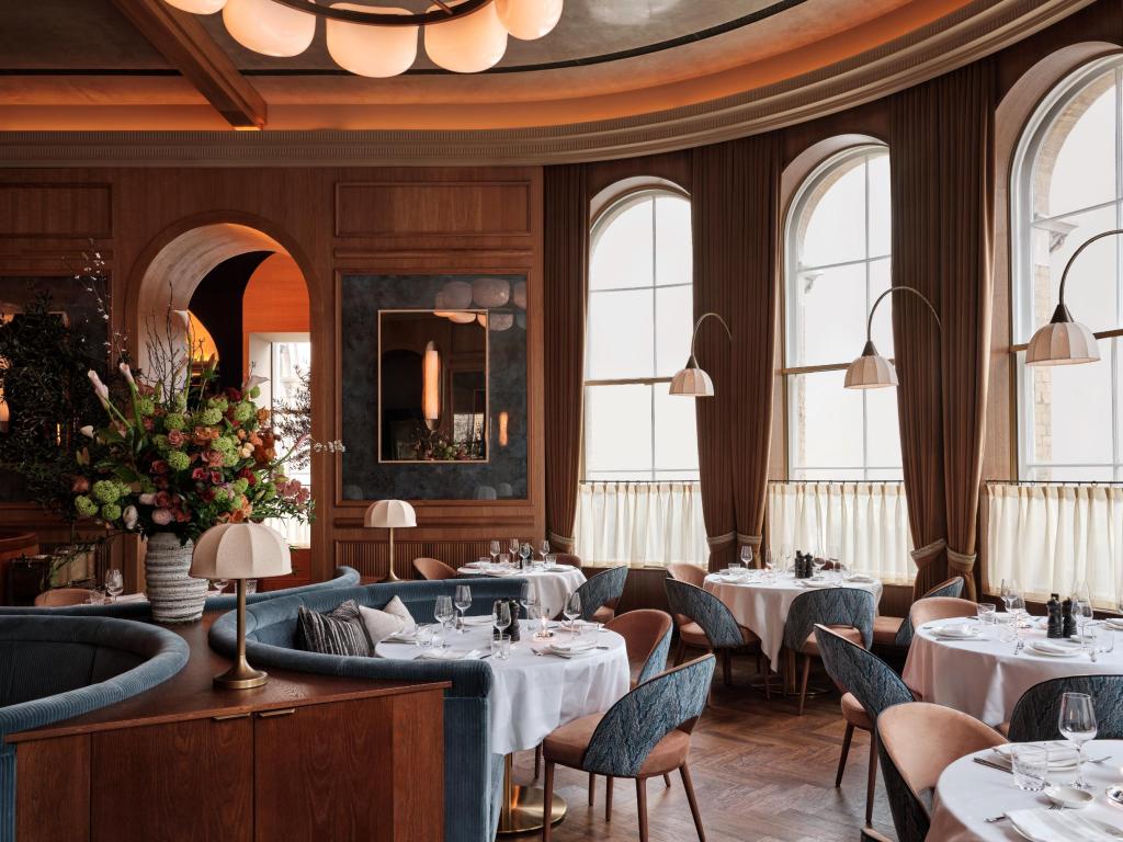 A striking warm interior stops the show with rich wood panelling, plush Italian fabrics, and a striking marble bar. Complementing this, bespoke artwork and coastal hues evoke a sense of sunlit escapism. It’s warm without being heavy, and elegant without trying too hard.