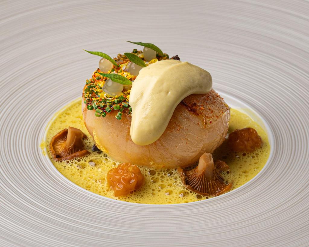 A Ceylon King Crab salad came as a delicate, chilled mound with consommé poured tableside, the apple giving it a bright, almost crystalline lift. Then came the dish already whispered about across London: the XXL hand-dived scallop from Tanera Mòr Island, the Scottish fishing village that now provides most of the restaurant’s seafood. Enormous, sweet, almost velvety, it arrived with mushrooms, pandan and a touch of cloudberries, one of those dishes that stops a conversation mid-sentence.