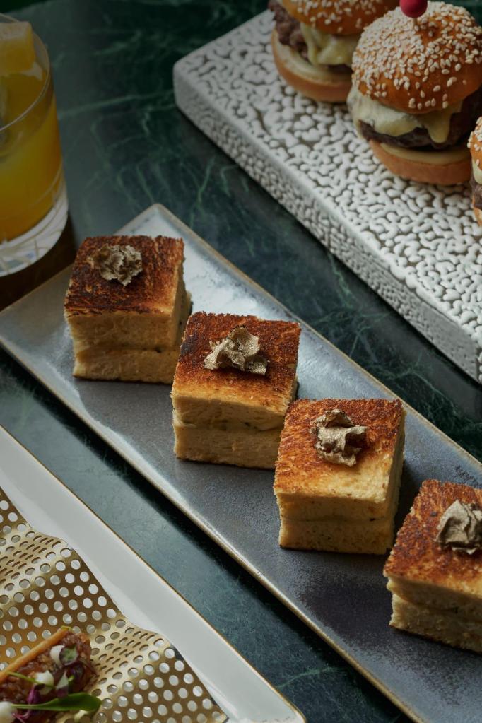 Pair your cocktails with a curated selection of small plates and sandwiches that echo the same attention to quality and creativity as the drinks. Start with the Scottish smoked salmon blinis, perfectly balanced trout roe on fluffy blinis and a tangy crème fraîche finish. For something richer, the truffle and Comté Cheese Toastie offers a luxurious twist on comfort food: layers of Comté melted with truffle béchamel sandwiched in soft pan de mie. These elegant bites are ideal for sharing, or enjoying solo, as a savoury counterpoint to the bar’s botanical cocktails.