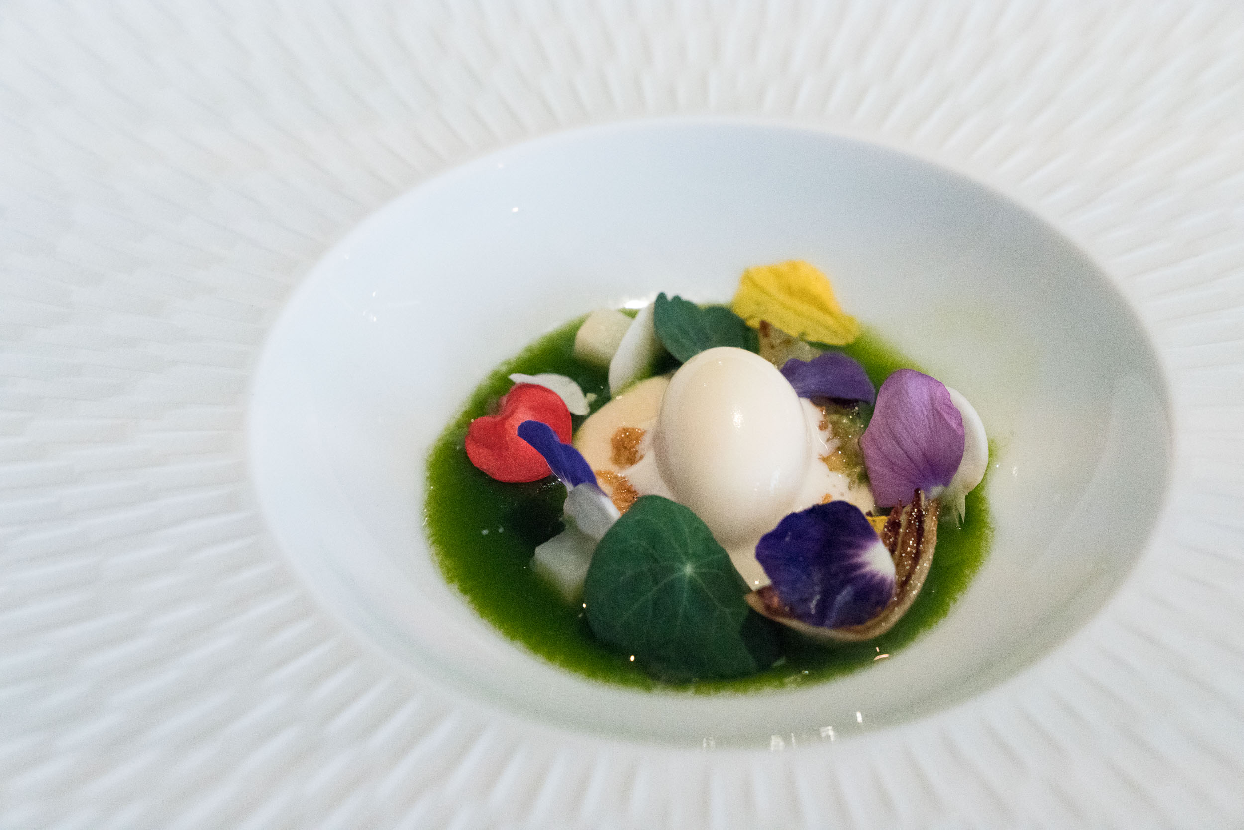Breakfast made an appearance over two courses starting with a really fun parsnip cereal with parsnip milk. Miniature cereal boxes reminiscent of everyone’s childhood contained a small package of dehydrated parsnip-infused cereal that was crunchy and sweet. The next course of pain perdu was a real tribute to everything The Fat Duck stands for – fun, creativity and flavour. We enjoyed this course in the kitchen where Abbi Thornton was orchestrating the intricacies of this world-famous kitchen. The pain perdu had a crunchy caramel coating, topped with a caramelised bacon rasher and of course, the iconic bacon and egg ice cream. The ice cream has its origins in Heston questioning the rule that you don’t heat an ice cream base above 85°C. Out of curiosity, he did, and got an ice cream with bursts of eggy flavour that reminded him of cutting into a boiled or fried egg. Bacon & egg ice cream was hatched.